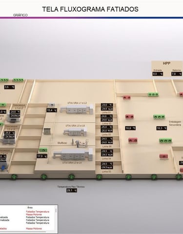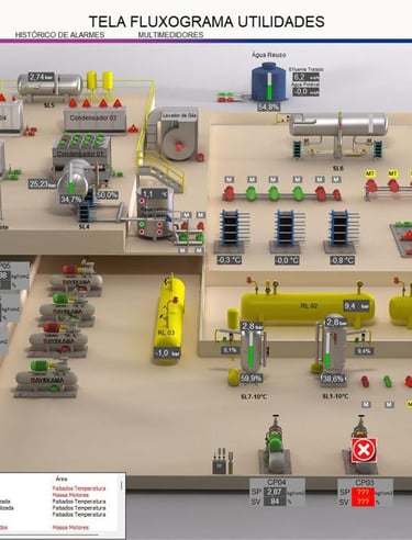 Desenvolvimento de telas de supervisão em 3D, ilustrando os ambientes e equipamentos do sistema.